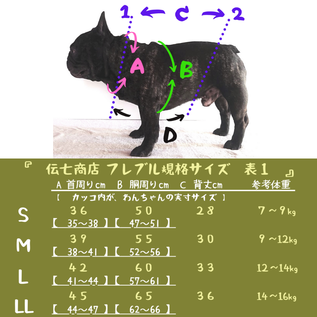 伝七商店のフレブル規格サイズ表 S・M・L・LL伝七商店のフレブル規格サイズ表 S長・M長・L短・L長